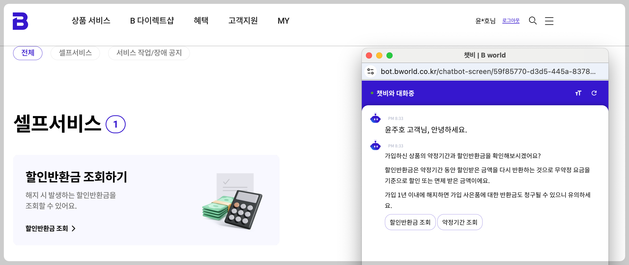 - 웹사이트 My B tv 로그인 → 할인반환금 조회하기 → 챗봇과 대화하여 위약금 조회
