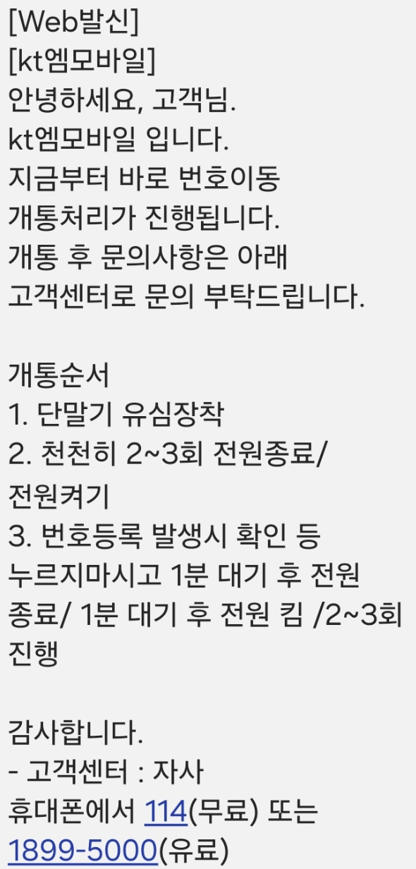 - 개통 완료: 약 10분 후 개통 완료 문자가 도착하고 바로 사용 가능